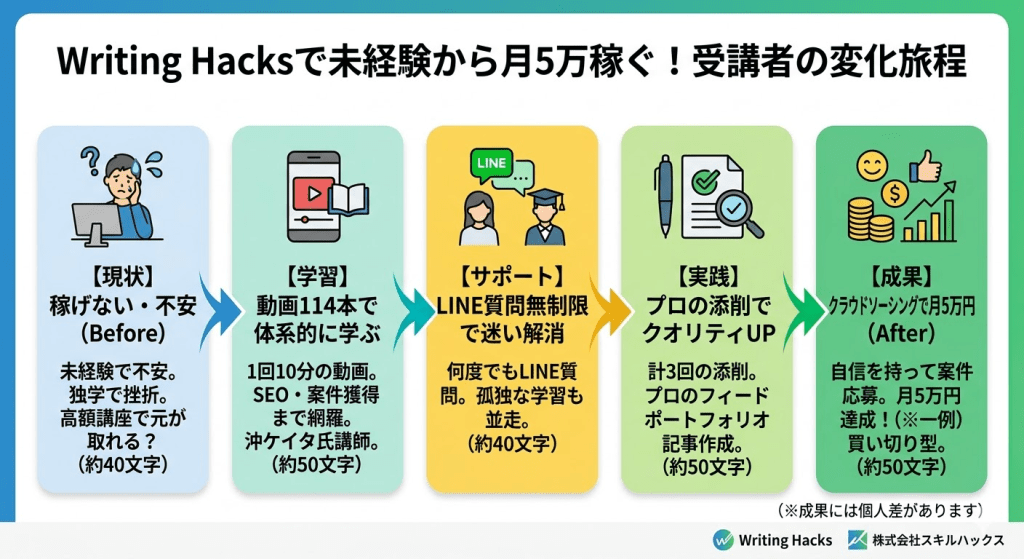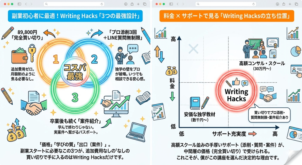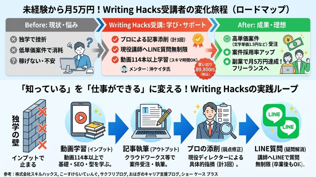 結論からお伝えすると、Writing Hacksは単なる「文章術の学習」で終わらず、初案件獲得から文字単価アップまでの「稼ぐ実務」に特化した、買い切り型の実践講座です。