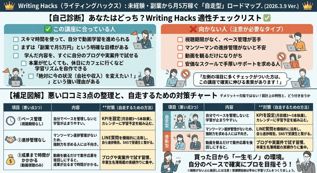 結論から言うと、Writing Hacksは**「本気で文字単価を上げ、最短で受講費を回収したい人」にとって、2026年現在も最もコスパの良い投資先**です。ただし、魔法の杖ではありません。「動画を観るだけで稼げる」と思っている方には、正直おすすめできません。