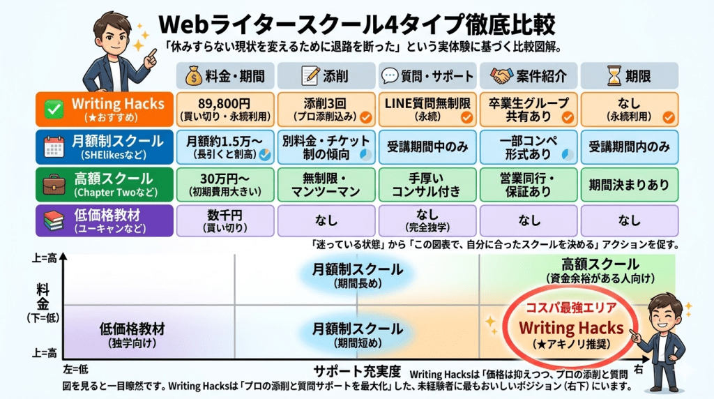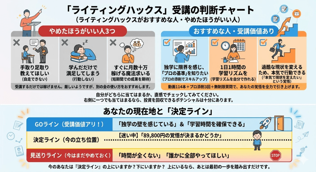 この記事では、Writing Hacksの評判・料金・サポート・向いている人の条件を、公式情報と受講生の声をもとに整理してきました。