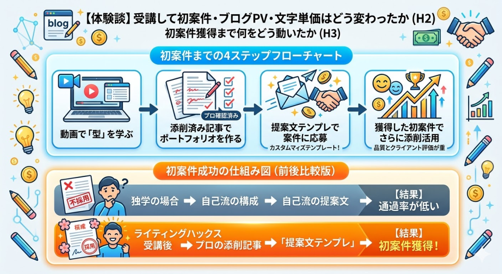 - 注意点:動画を視聴するだけでは変化は生まれない。添削・質問サポートを積極的に活用し、実案件に応募する行動が前提