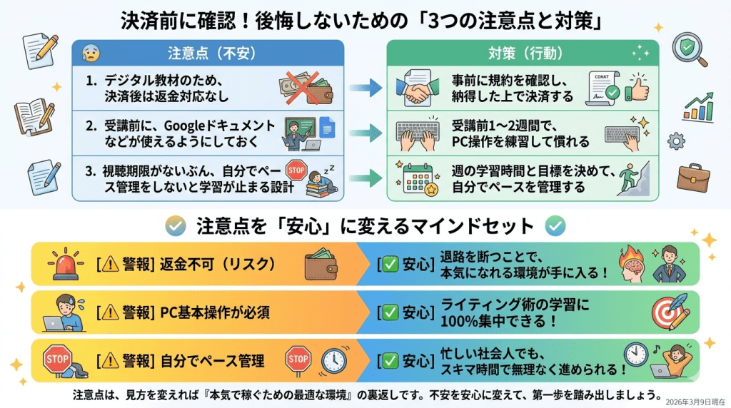 これらは欠点ではなく、この講座の設計上の前提条件です。事前に把握しておくことで、受講後の「思っていたのと違う」という状況を避けやすくなります。